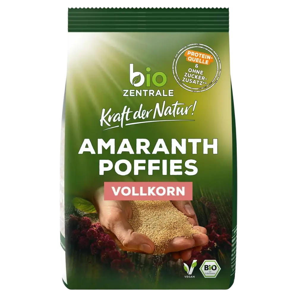 Unsere biozentrale Amaranth Poffies sind gepuffte, kleine Amaranth-Körner ohne Zuckerzusatz**. Die köstlichen, körnig-frischen Poffies bereichern als Proteinquelle Müslis, Joghurts & bunte Frühstücks-Bowls.