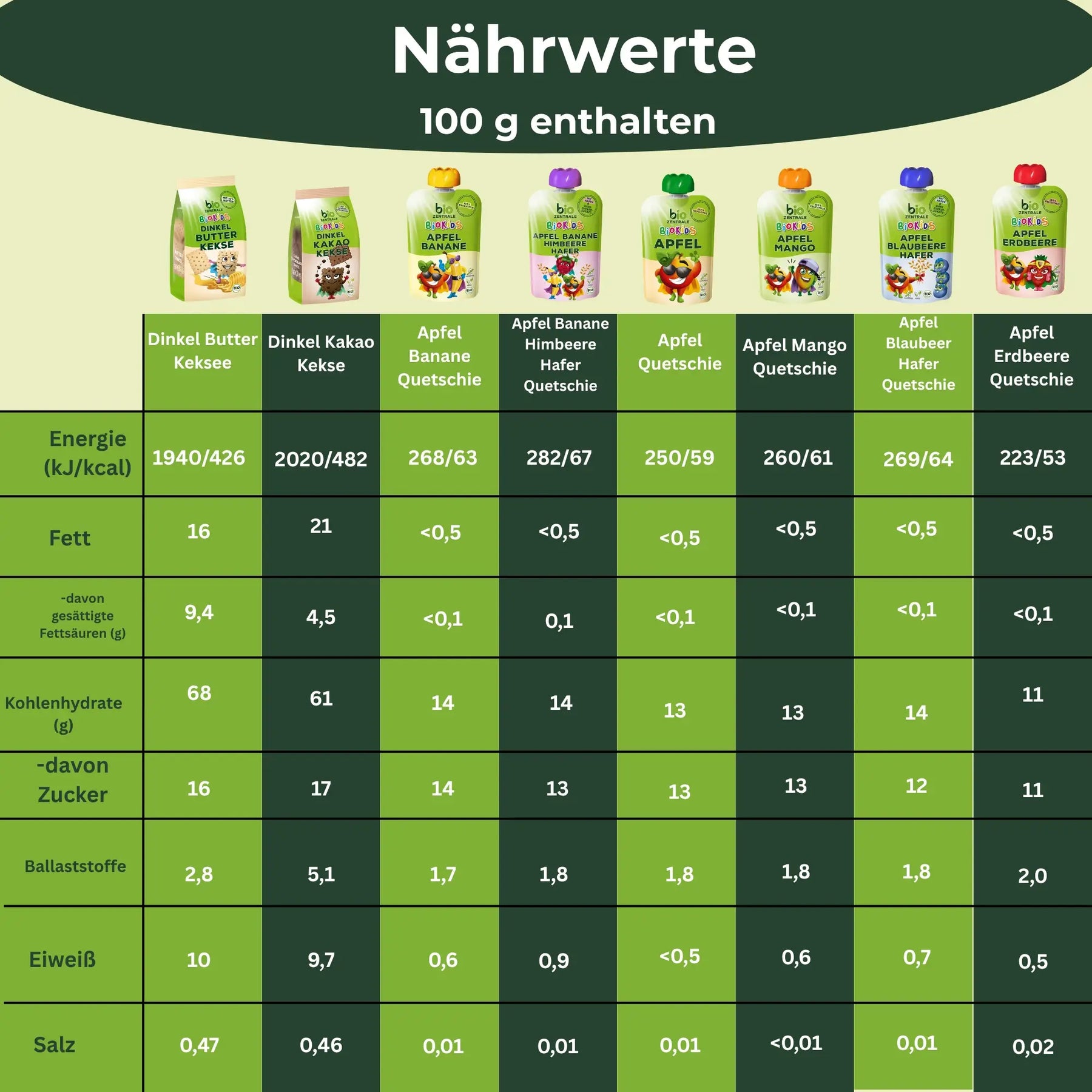 Dinkel-Butterkekse pro 100 g Energie [kJ/kcal] 1940/426 Fett [g] 16 — davon gesättigte Fettsäuren [g] 9,4 Kohlenhydrate [g] 68 — davon Zucker [g] 16 Ballaststoffe [g] 2,8 Eiweiß [g] 10 Salz [g] 0,47 Dinkel-Kakaokekse pro 100 g Brennwert [kJ/kcal] 2020/482 Fett [g] 21 — davon gesättigte Fettsäuren [g] 4,5 Kohlenhydrate [g] 61 — davon Zucker [g] 17 Ballaststoffe [g] 5,1 Eiweiß [g] 9,7 Salz [g] 0,46 Fruchtmus Apfel pro 100 g Brennwert [kJ/kcal] 250/59 Fett [g] <0,5 — davon gesättigte Fettsäuren [g] <0,1 Kohlenhydrate [g] 13 — davon Zucker [g] 13 Ballaststoffe [g] 1,8 Eiweiß [g] <0,5 Salz [g] 0,01 Fruchtmus Apfel-Banane pro 100 g Brennwert [kJ/kcal] 268/63 Fett [g] < 0,5 — davon gesättigte Fettsäuren [g] <0,1 Kohlenhydrate [g] 14 — davon Zucker [g] 14 Ballaststoffe [g] 1,7 Eiweiß [g] 0,6 Salz [g] 0,01 Fruchtmus Apfel-Erdbeere pro 100 g Brennwert [kJ/kcal] 223/53 Fett [g] < 0,5 — davon gesättigte Fettsäuren [g] < 0,1 Kohlenhydrate [g] 11 — davon Zucker [g] 11 Ballaststoffe [g] 2,0 Eiweiß [g] 0,5 Salz [g] 0,02 Fruchtmus Apfel-Mango pro 100 g Brennwert [kJ/kcal] 260/61 Fett [g] <0,5 — davon gesättigte Fettsäuren [g] < 0,1 Kohlenhydrate [g] 13 — davon Zucker [g] 13 Ballaststoffe [g] 1,8 Eiweiß [g] 0,6 Salz [g] <0,01 Fruchtmus Apfel-Blaubeere-Hafer pro 100 g Brennwert [kJ/kcal] 269/64 Fett [g] < 0,5 — davon gesättigte Fettsäuren [g] < 0,1 Kohlenhydrate [g] 14 — davon Zucker [g] 12 Ballaststoffe [g] 1,8 Eiweiß [g] 0,7 Salz [g] 0,01 Fruchtmus Apfel-Banane-Himbeere-Hafer pro 100 g Brennwert [kJ/kcal] 282/67 Fett [g] < 0,5 — davon gesättigte Fettsäuren [g] 0,1 Kohlenhydrate [g] 14 — davon Zucker [g] 13 Ballaststoffe [g] 1,8 Eiweiß [g] 0,9 Salz [g] 0,01