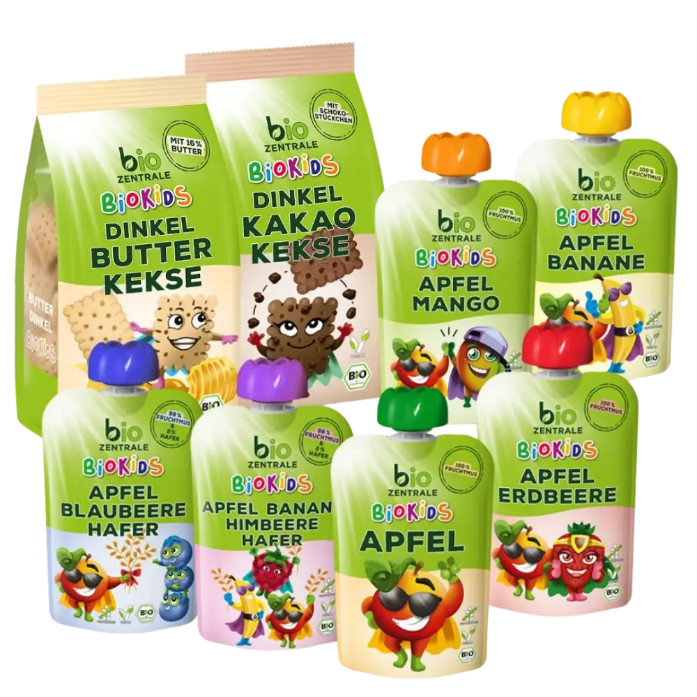 Das BioKids Snack-Box enthält jeweils einen unseren leckeren BioKids Quetschies, sowie unsere neuen BioKids Dinkel-Butterkekse und BioKids Dinkel-Kakaokekse.