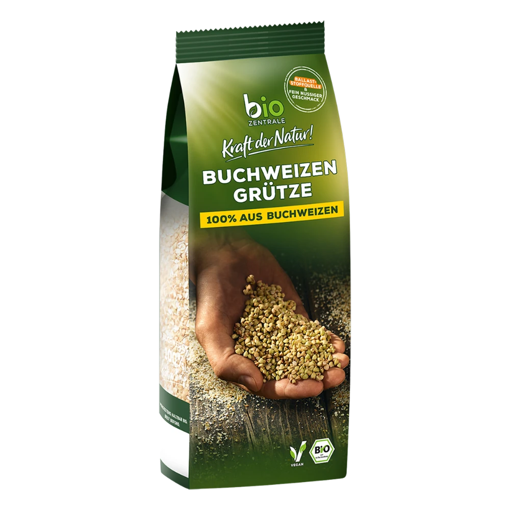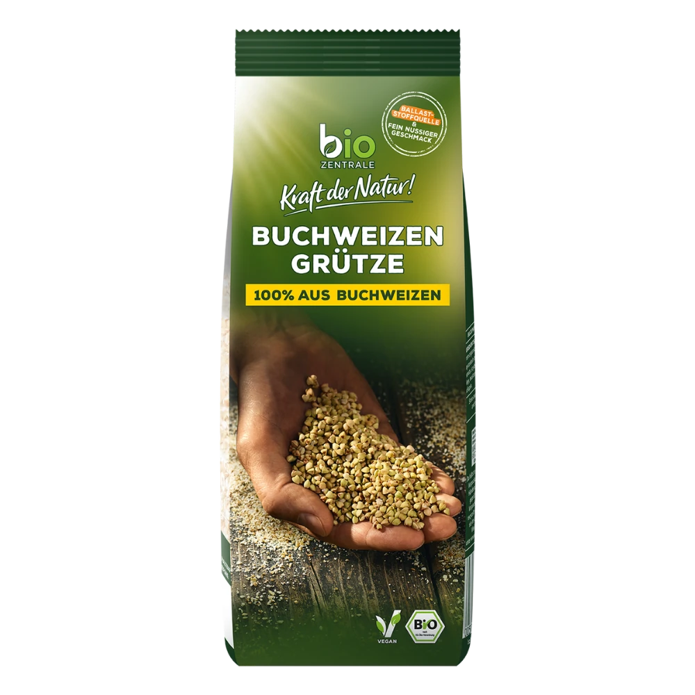 Unsere biozentrale Buchweizengrütze mit ihrem naturbelassenen, fein-nussigen Geschmack ist eine Ballaststoffquelle und wird aus ganzen Buchweizenkörnern geschrotet. Obwohl es Buchweizen heißt, ist es aber nicht mit dem Weizen verwandt und daher von Natur aus glutenfrei. Durch die Herstellung und Verarbeitung können jedoch Spuren von Gluten im Produkt enthalten sein, da glutenhaltiges Getreide auf denselben Anlagen verarbeitetet wird. Unsere Buchweizengrütze ist vielseitig einsetzbar, z. B. zur Ergänzung von Müslis, als süßer oder herzhafter Brei, als deftige Beilage oder auch zum Backen von Brot, Pfannkuchen, Waffeln und Kuchen.