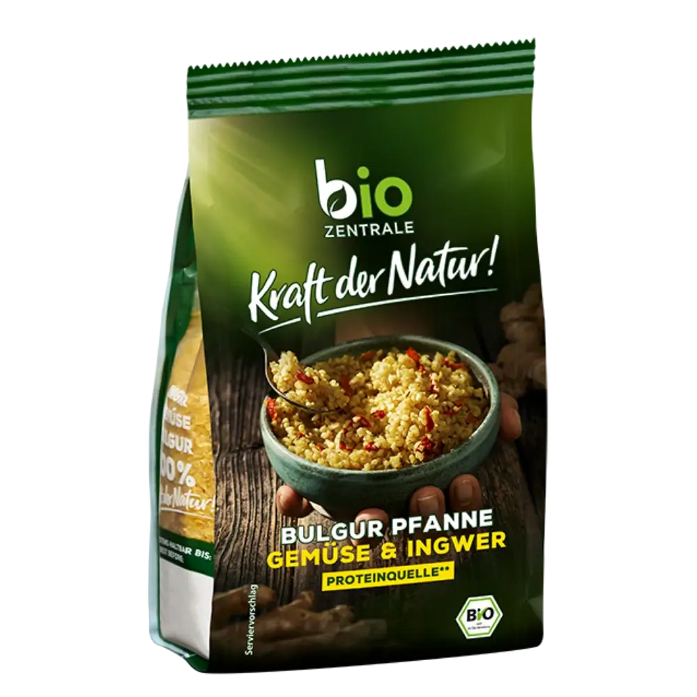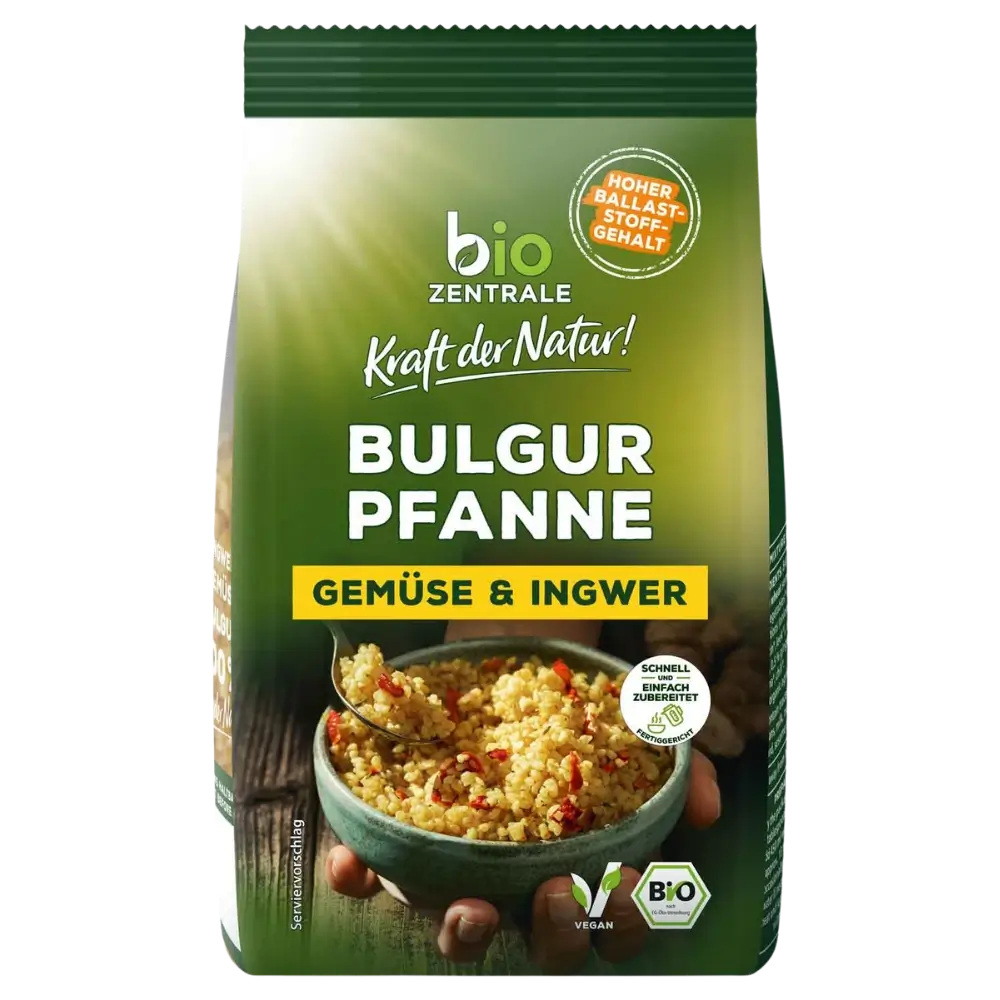 84 % BULGUR* (HartWEIZENgrieß*), 9,5 % Gemüse* in veränderlichen Gewichtsanteilen (Zwiebeln*, Paprika*, Kürbis*, Lauch*), Meersalz, Knoblauch*, 0,5 % Ingwer*, Cumin*, Kurkuma*, Chili*.