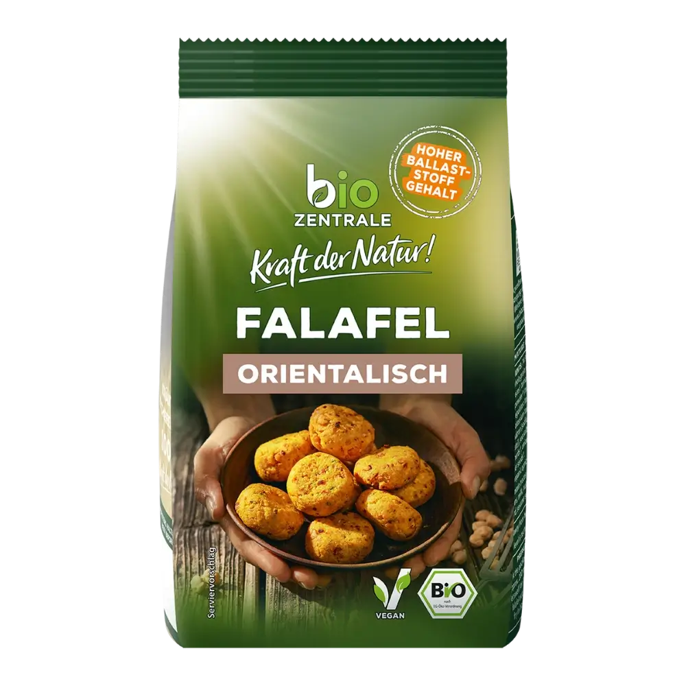 Den Packungsinhalt mit ca. 200 ml kaltem Wasser mischen und 10 Minuten quellen lassen. Aus der Masse Falafel formen und in heißem Öl goldbraun anbraten.