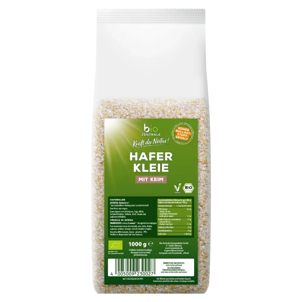 Unsere biozentrale Haferkleie ist herrlich zart und eine ideale Grundlage für ein ausgewogenes und abwechslungsreiches Frühstück. Unsere Haferkleie ist eine ballaststoffreiche Proteinquelle und enthält von Natur aus Beta-Glucane. Beta-Glucane tragen zur Aufrechterhaltung eines normalen Cholesterinspiegels im Blut bei. Die positive Wirkung stellt sich bei einer täglichen Aufnahme von 3 g Beta-Glucanen aus Hafer ein. Eine 25 g Portion biozentrale Haferkleie enthält 1 g Beta-Glucan – das entspricht einem Drittel der täglich empfohlenen Menge von 3 g.