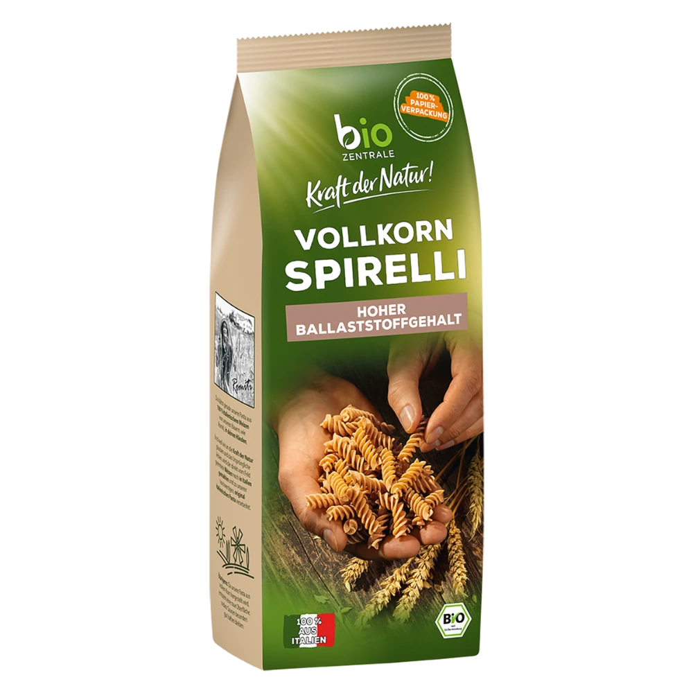 Unsere biozentrale Spirelli aus dem vollen Weizenkorn werden traditionell in Italien hergestellt. Die Herstellung aus dem vollen Korn sorgt dafür, dass die Oberfläche unserer Pasta rauer ist. Dadurch kann die Sauce von unseren Spirelli besser aufgenommen werden. Zudem sorgt die behutsame, langsame Trocknungszeit dafür, dass die Nährstoffe und der ursprüngliche Geschmack bestmöglich bewahrt werden. Kombiniere unsere Vollkorn Spirelli mit unserer vielfältigen Auswahl an biozentrale Saucen und Pestos.